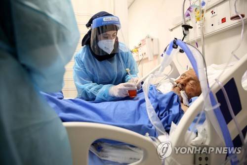 epa08935014 A Palestinian medical worker checks a patient at the COVID-19 section of Dura hospital in the West Bank city of Dura near Hebron, 13 January 2021. Palestinian health officials announced the first shipment of the AstraZeneca COVID-19 vaccine will arrive by end of February, while Prime Minister Mohammad Ishtayeh said the Ministry of Health signed with three other companied to provide vaccine which will arrive within the next two months. EPA/ABED AL HASHLAMOUN
