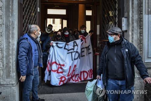 epa08935032 Students of the Manzoni high school protest against distance learning (Didattica a Distanza, DAD) amid a second wave of the coronavirus disease (COVID-19) pandemic, in Milan, northern Italy, 13 January 2021. High schools in Lombardy region are expected to reopen on 25 January. The Italian government decided to delay the original return date of 07 January due to a rise in COVID-19 infections in the country, however different measures are applied to different regions according to their infection levels. EPA/MATTEO CORNER