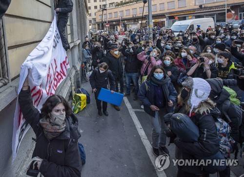 epa08935035 Students of the Manzoni high school protest against distance learning (Didattica a Distanza, DAD) amid a second wave of the coronavirus disease (COVID-19) pandemic, in Milan, northern Italy, 13 January 2021. High schools in Lombardy region are expected to reopen on 25 January. The Italian government decided to delay the original return date of 07 January due to a rise in COVID-19 infections in the country, however different measures are applied to different regions according to their infection levels. EPA/ANDREA FASANI