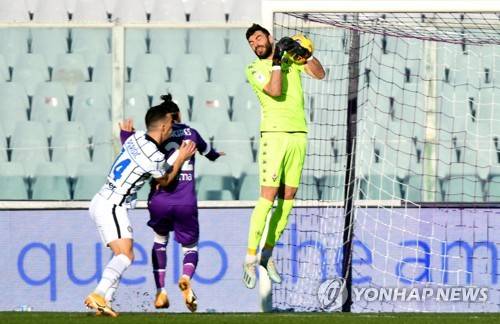 epa08935052 Fiorentina's goalkeeper Pietro Terracciano (R) in action during the Italian Cup round of 16 soccer match between ACF Fiorentina and Inter Milan at Artemio Franchi stadium in Florence, Italy, 13 January 2021. EPA/Claudio Giovannini