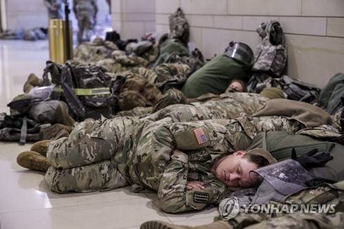 Hundreds of National Guard troops hold inside the Capitol Visitor's Center to reinforce security at the Capitol in Washington, Wednesday, Jan. 13, 2021. The House of Representatives is pursuing an article of impeachment against President Donald Trump for his role in inciting an angry mob to storm the Capitol last week. (AP Photo/J. Scott Applewhite)