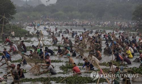 Villagers participate in community fishing as part of Bhogali Bihu celebrations in Panbari village, some 50 kilometers (31 miles) east of Gauhati, in the northeastern state of Assam, Wednesday, Jan. 13, 2021. Bhogali Bihu marks the end of the harvest season in the northeastern state of Assam. (AP Photo/Anupam Nath)