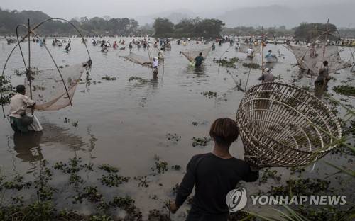 Villagers participate in community fishing as part of Bhogali Bihu celebrations in Panbari village, some 50 kilometers (31 miles) east of Gauhati, in the northeastern state of Assam, Wednesday, Jan. 13, 2021. Bhogali Bihu marks the end of the harvest season in the northeastern state of Assam. (AP Photo/Anupam Nath)