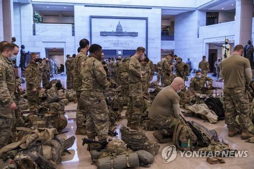 Hundreds of National Guard troops hold inside the Capitol Visitor's Center to reinforce security at the Capitol in Washington, Wednesday, Jan. 13, 2021. The House of Representatives is pursuing an article of impeachment against President Donald Trump for his role in inciting an angry mob to storm the Capitol last week. (AP Photo/J. Scott Applewhite)