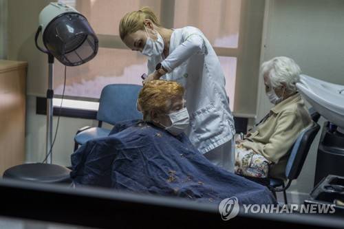A hairdresser wearing a face mask to prevent the spread of coronavirus cuts the hairs of a resident at DomusVi nursing home in Leganes, Spain, Wednesday, Jan. 13, 2021. Spain's rate of infection has shot up to 435 cases per 100,000 residents in the past two weeks, prompting new restrictions as authorities try to bring vaccination up to speed. (AP Photo/Manu Fernandez)