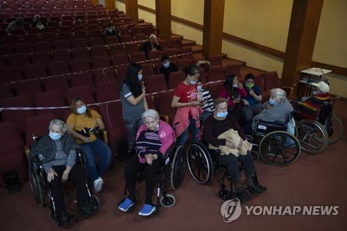 Elderly Israeli women wait to receive the second Pfizer-BioNTech COVID-19 vaccine from a Magen David Adom national emergency service volunteer, at a private nursing home, in Ramat Gan, Israel, during a nationwide lockdown to curb the spread of the virus, Wednesday, Jan. 13, 2021. (AP Photo/Oded Balilty)