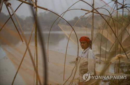A villager participates in community fishing as part of Bhogali Bihu celebrations in Panbari village, some 50 kilometers (31 miles) east of Gauhati, in the northeastern state of Assam, Wednesday, Jan. 13, 2021. Bhogali Bihu marks the end of the harvest season in the northeastern state of Assam. (AP Photo/Anupam Nath)