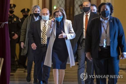 epa08935085 Speaker of the House Nancy Pelosi walks to her office following her arrival at the US Capitol in Washington, DC, USA, 13 January 2021. Today the House starts the impeachment of US President Donald J. Trump for inciting the insurrection that lead to the storming of the US Capitol by Trump partisans. EPA/SHAWN THEW