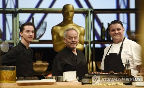 FILE - Chef Wolfgang Puck, center, is flanked by his son Byron, left, and Eric Klein, vice president of culinary at Wolfgang Puck Catering appear at the press preview for the 91st Academy Awards Governors Ball in Los Angeles on Feb. 15, 2019. A new four-part documentary series, “The Event,” shows the intense planning and details that go into high-profile catering. The series premieres on HBO Max on Jan. 14. (Photo by Chris Pizzello/Invision/AP, File) 021519124827, 21334631,