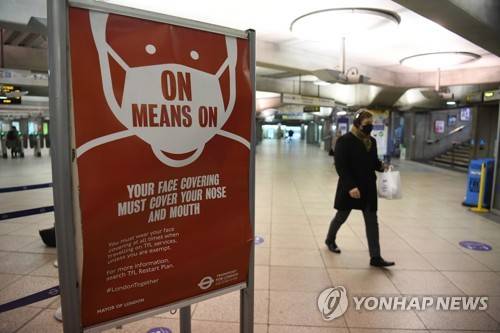 epa08935122 A masked woman man a notice encouraging the wearing of face masks in a tube station in London, Britain 13 January 2021. A national lockdown across England began on midnight on 05 January 2021. 2020 saw the largest increase in UK deaths in a single year since 1940, according to provisional ONS figures. In 2020, nearly 697,000 deaths were registered, compared with an average of nearly 606,000 each year between 2015 and 2019 EPA/NEIL HALL