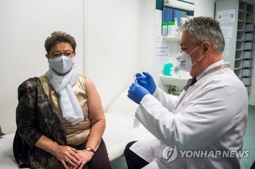 epa08935143 Chief Medical Officer Cecilia Mueller, Head of the National Public Health Center (L) is vaccinated with Pfizer-Biontech's vaccine against COVID-19 by Director General Robert J. Bedros at the Szent Imre Teaching Hospital in Budapest, Hungary, 13 January 2021. EPA/Zoltan Balogh HUNGARY OUT