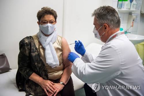 epa08935144 Chief Medical Officer Cecilia Mueller, Head of the National Public Health Center (L) is vaccinated with Pfizer-Biontech's vaccine against COVID-19 by Director General Robert J. Bedros at the Szent Imre Teaching Hospital in Budapest, Hungary, 13 January 2021. EPA/Zoltan Balogh HUNGARY OUT