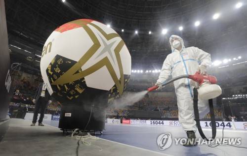 epa08935344 Medical staff of the tournament, dressed in protective gear, disinfects the court ahead of the opening match between Egypt and Chile at the 27th Men's Handball World Championship, in Cairo, Egypt, 13 January 2021. EPA/Mohamed Abd El Ghany / POOL