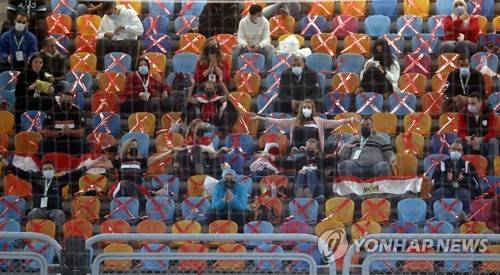 epa08935650 Tournament staff watch the opening match between Egypt and Chile at the 27th Men's Handball World Championship, in Cairo, Egypt, 13 January 2021. EPA/Mohamed Abd El Ghany / POOL
