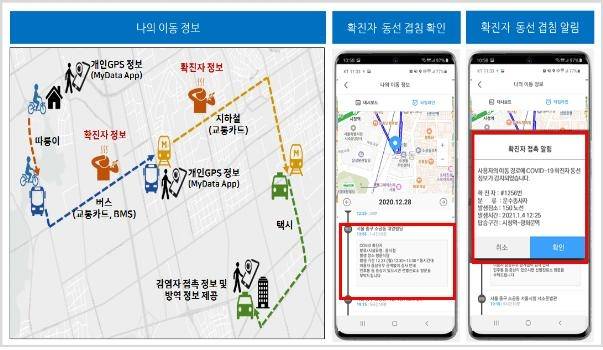 사용자의 개인 위치정보(GPS)와 대중교통 운행정보, 교통카드 승하차정보, 교통수단별 와이파이 정보 등을 수집·분석한 뒤 확진자 이동 동선을 비교해 확진자 접촉 가능성을 알려준다.