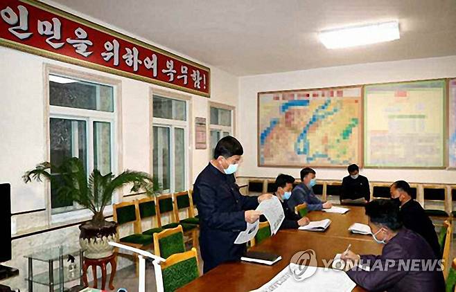 (서울=연합뉴스) 노동당 기관지 노동신문은 14일 각지 주민들이 8차 당대회 결정을 학습하고 있다고 보도했다. 사진은 신의주시인민위원회에서 진행 중인 학습 모습. 2021.1.14 [노동신문 홈페이지 캡처. 재판매 및 DB 금지]