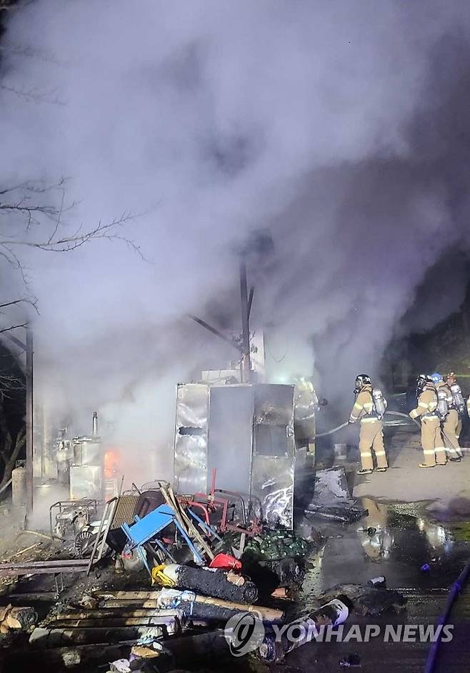 (춘천=연합뉴스) 지난 13일 오후 8시 13분께 춘천시 북산면 오항리의 창고 건물에서 전기적 요인으로 추정되는 불이 나 소방대원들이 진화작업을 벌이고 있다. 2021.1.14 [춘천소방서 제공. 재판매 및 DB 금지]