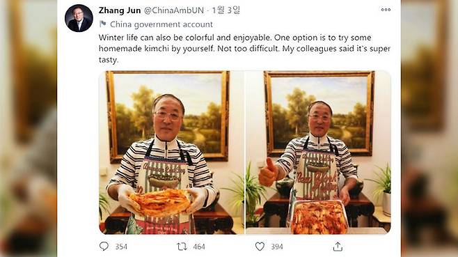 앞치마를 두르고 갓 담근 김치를 들어 올린 남성, 장쥔 유엔 주재 중국 대사인데요, 지난 3일 자신의 SNS에 '겨울을 즐기는 방법 가운데 하나는 손수 만든 김치를 먹어보는 것'이라는 글과 함께 올린 사진입니다.