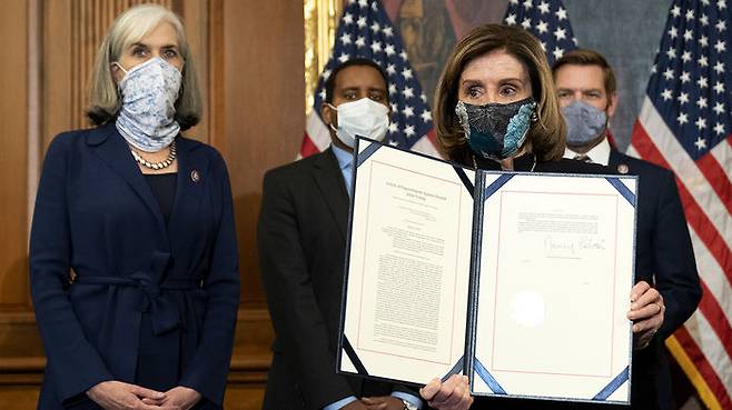 펠로시 의장은 취재진 앞에서 하원이 통과시킨 탄핵소추안에 서명했습니다.