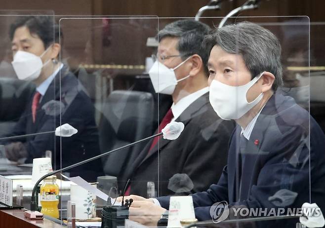 (서울=연합뉴스) 김승두 기자 = 이인영 통일부 장관이 14일 정부서울청사 통일부 대회의실에서 열린 제318차 남북교류협력추진협의회를 주재하며 발언하고 있다. 2021.1.14
