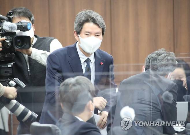 (서울=연합뉴스) 김승두 기자 = 이인영 통일부 장관이 14일 정부서울청사 통일부 대회의실에서 열린 제318차 남북교류협력추진협의회에 참석하며 인사하고 있다. 2021.1.14