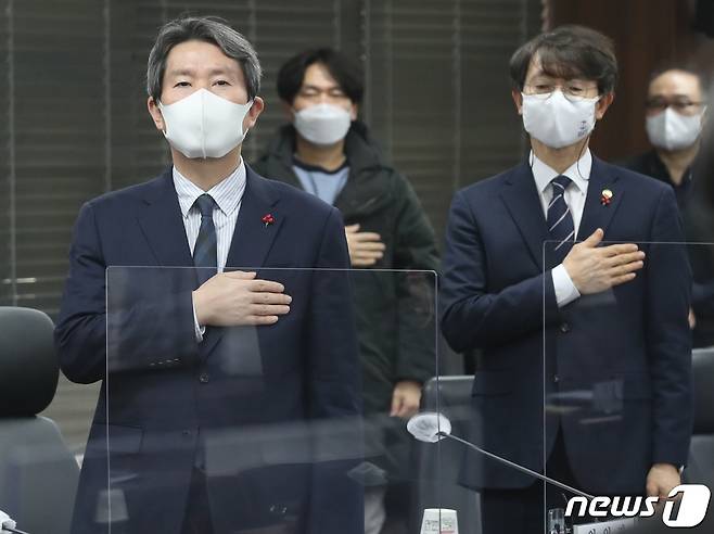 (서울=뉴스1) 송원영 기자 = 이인영 통일부 장관이 14일 오전 서울 종로구 정부서울청사에서 열린 제318차 남북교류협력추진협의회에서 국기에 경례를 하고 있다. 2021.1.14/뉴스1