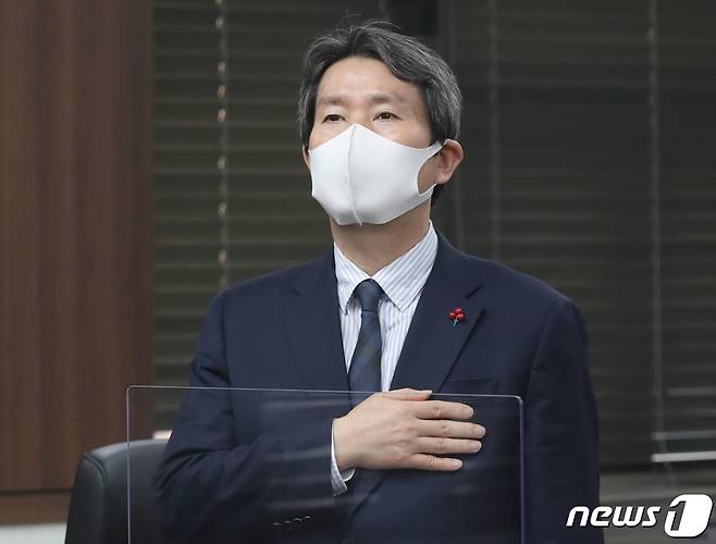 (서울=뉴스1) 송원영 기자 = 이인영 통일부 장관이 14일 오전 서울 종로구 정부서울청사에서 열린 제318차 남북교류협력추진협의회에서 국기에 경례를 하고 있다. 2021.1.14/뉴스1