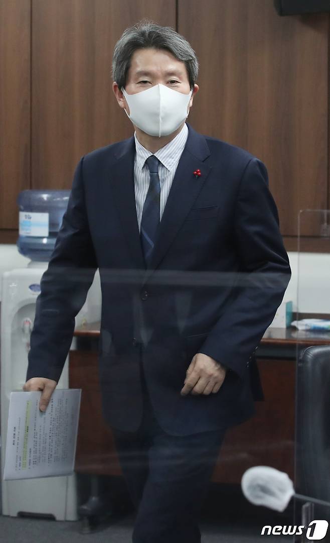(서울=뉴스1) 송원영 기자 = 이인영 통일부 장관이 14일 오전 서울 종로구 정부서울청사에서 열린 제318차 남북교류협력추진협의회에 참석하고 있다. 2021.1.14/뉴스1