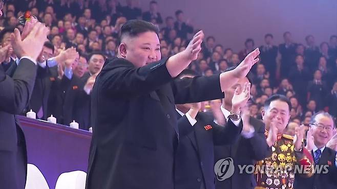 (서울=연합뉴스) 북한 조선중앙TV는 14일 김정은 국무위원장이 전날 평양체육관에서 열린 8차 당대회 기념 공연 '당을 노래하노라'를 관람했다고 보도했다. 이달 5∼12일 열린 당대회에서는 시종일관 엄숙한 표정이었던 김 위원장이 이날은 활짝 웃으며 만족감을 표했다. 조선중앙통신은 "총비서 동지께서 출연자들의 공연성과에 만족을 표시했다"고 보도했다. [조선중앙TV 화면] 2021.1.14