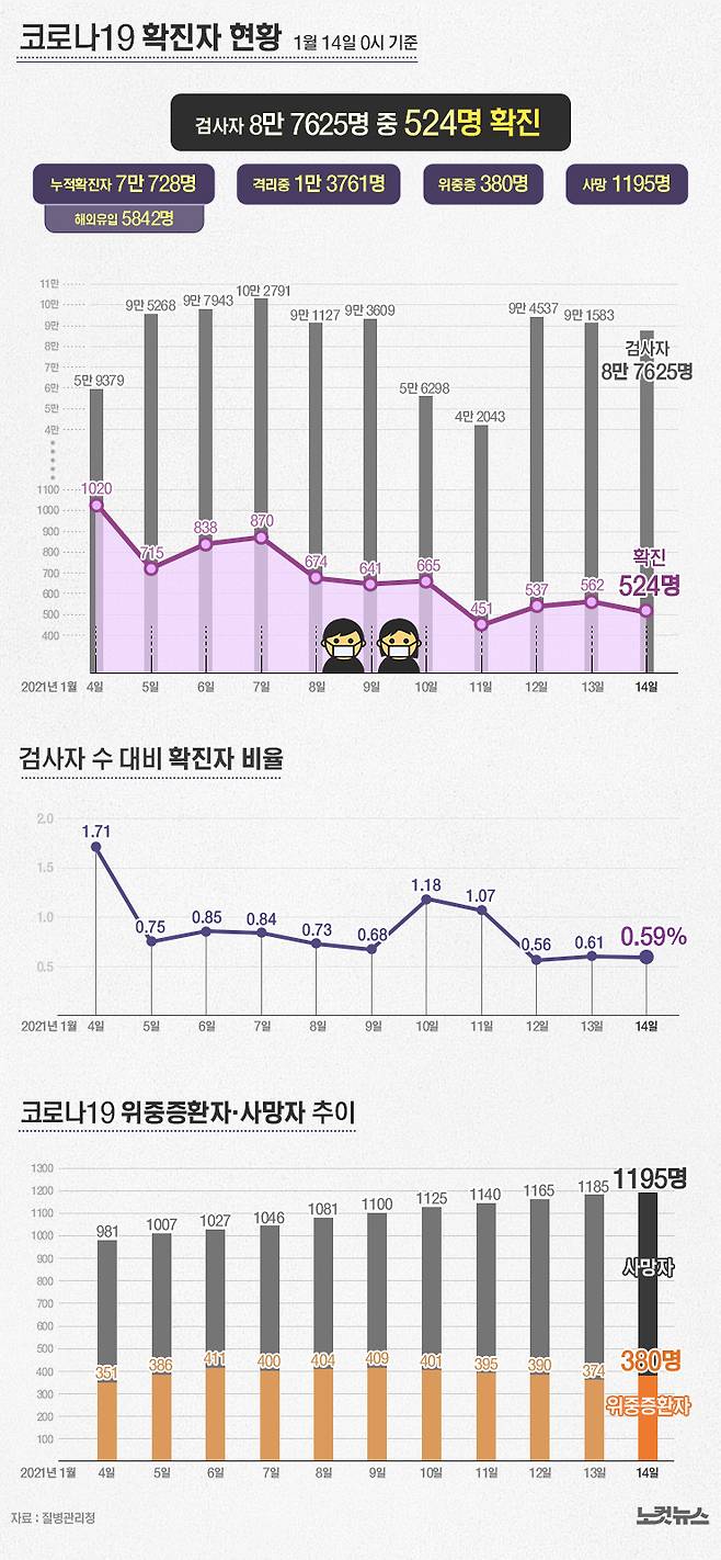 질병관리청은 14일 0시 기준으로 코로나19 국내 확진자 524명(해외유입 28명)이 새로 확인돼 누적 확진자는 7만 728명이라고 밝혔다. 위중증 환자는 380명, 사망자는 10명 늘어 1195명(치명률 1.69%)이다.