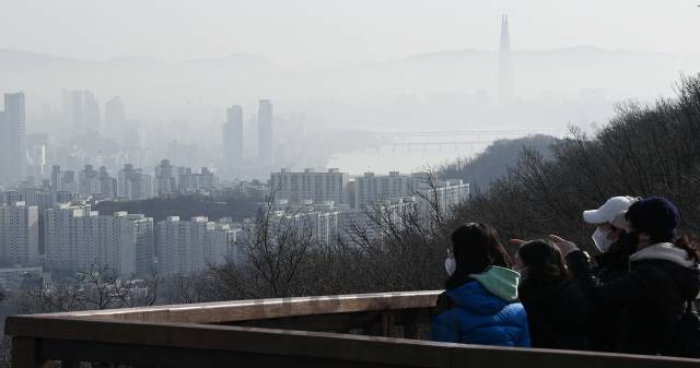 [서울경제] 인천·경남·제주를 제외한 전국 대부분 지역의 미세먼지 농도가 '나쁨' 수준을 보이고 고비사막과 내몽골에서 발원한 황사가 한반도에 유입된 14일 오전 서울 중구 남산에서 바라본 송파구 일대가 짙은 안개에 갇혀 있다./오승현기자 2021.01.14
