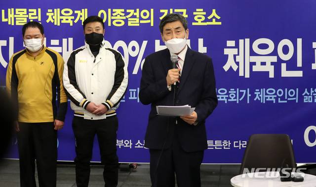 [서울=뉴시스]이영환 기자 = 대한체육회장 선거에 출마한 이종걸 후보가 14일 서울 중구의 한 피트니스 센터에서 기자회견을 하고 있다. 이 후보는 체육 기금 1조원을 확보해 체육인 1인당 1000만원의 피해 보상금을 지급할 것이라고 밝혔다. 2021.01.14. 20hwan@newsis.com
