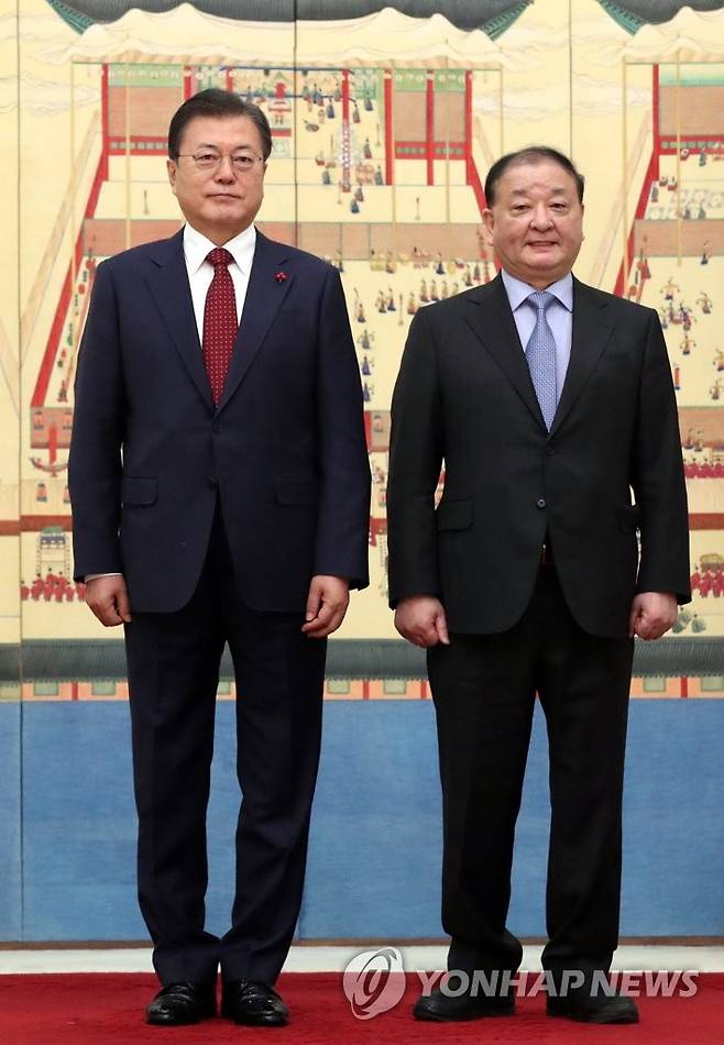 (서울=연합뉴스) 최재구 기자 = 문재인 대통령이 14일 청와대에서 강창일 주일대사에게 신임장을 수여한 후 기념촬영 하고 있다. 2021.1.14