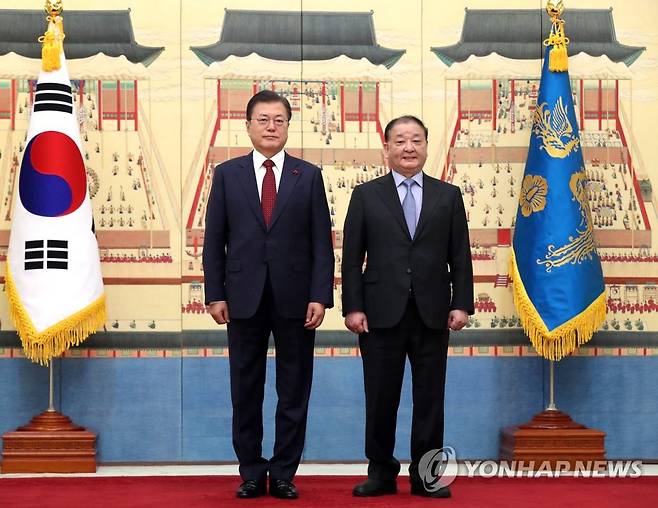 (서울=연합뉴스) 최재구 기자 = 문재인 대통령이 14일 청와대에서 강창일 주일대사에게 신임장을 수여한 후 기념촬영 하고 있다. 2021.1.14