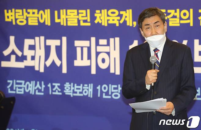 (서울=뉴스1) 송원영 기자 = 제41대 대한체육회장 선거에 나선 이종걸 민족화해협력범국민협의회 대표 상임의장이 14일 서울 중구 스포애니 피트니스클럽에서 기자회견을 하고 있다. 이날 이종걸 후보는 "코로나19로 체육인들이 생계 걱정을 넘어 생존 위기에 몰렸다"며, "체육 기금 1조원 확보해 체육인 1인당 1천만 원을 지급하겠다"고 공약했다. 2021.1.14/뉴스1