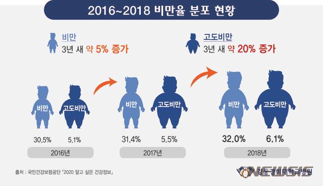 14일 국민건강보험공단 건강검진통계연보에 따르면 2016년 5.1%였던 고도비만인은 2017년 5.5%, 2018년 6.1%로 꾸준히 증가했다.