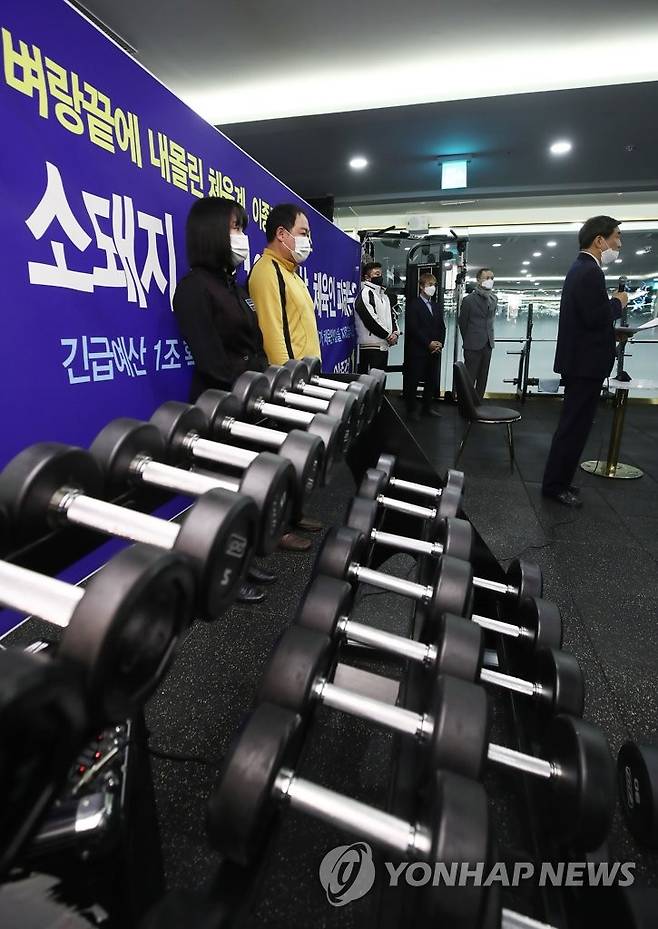 (서울=연합뉴스) 진연수 기자 = 제41대 대한체육회장 선거에 나선 이종걸 후보가 14일 서울 중구 한 피트니스 센터에서 긴급 기자회견을 하고 있다. 이종걸 후보는 "코로나19 여파로 체육인들이 생존 위기에 몰렸다며, 긴급 체육 기금 1조 원을 확보해 체육인 1인당 1천만 원의 피해 보상금을 지급하겠다"고 발표했다. 2021.1.14