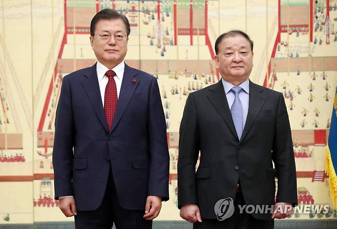 (서울=연합뉴스) 최재구 기자 = 문재인 대통령이 14일 청와대에서 강창일 주일대사에게 신임장을 수여한 후 기념촬영 하고 있다. 2021.1.14