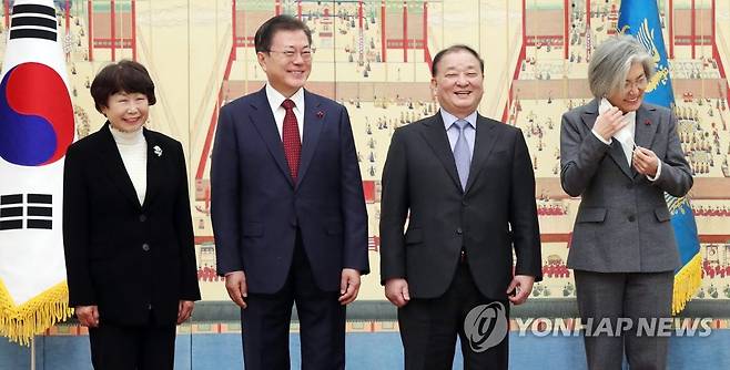 (서울=연합뉴스) 최재구 기자 = 문재인 대통령이 14일 청와대에서 강창일 주일대사에게 신임장을 수여한 후 강 대사 내외, 강경화 외교부 장관과 기념촬영을 하고 있다. 2021.1.14