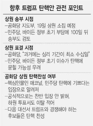 이 과정에서 공화당이 트럼프 탄핵에 찬성할 가능성도 배제할 수는 없다. 워싱턴 정가에 트럼프 대통령이 오는 2024년 재출마를 원한다는 사실이 널리 퍼진 상황에서 탄핵안 통과는 공화당 유력 주자들에게 기회가 될 수 있다. 이번 사태를 겪으며 마이크 펜스 부통령에 대한 관심도 크게 올라간 상황이다. BBC는 “2024년에 잠재적 경쟁자가 될 수 있는 공화당의 벤 새스 네브래스카 상원의원 같은 인사들에게는 탄핵이 트럼프의 공직 출마를 원천 봉쇄할 수 있는 방안”이라고 전했다. 이와 관련해 민주당은 탄핵된 공직자의 공직 취임을 제한하는 안건을 별도로 추진할 예정이다. 이 안건은 상원에서 과반수만 확보하면 된다.