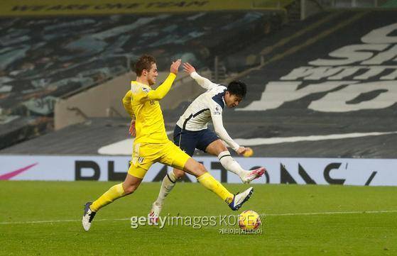 후반 들어 기회를 엿보던 손흥민은 후반 26분 드디어 아레올라의 손을 벗어나는 결정적 슈팅을 때렸다. 하지만 이번에는 골대가 막아섰다. 은돔벨레의 패스를 받아 때린 왼발 슈팅은 오른쪽 골대를 맞고 튀어 나왔다. '골대 불운'에 땅을 쳐야 했다. 3번의 득점 찬스를 놓친 손흥민은 1-1 동점이었던 후반 44분 세르히오 레길론에게 결정적 패스를 찔러 넣었다. 손흥민이 페널티박스 안에서 공을 받아 레길론에게 밀어줬다. 레길론이 그대로 차 넣으며 득점에 성공했다. 하지만 손흥민의 위치가 오프사이드로 선언돼 골은 무효가 됐다. 손흥민은 매서웠지만 공격 포인트를 올리지 못한 채 그라운드를 빠져나와야 했다.