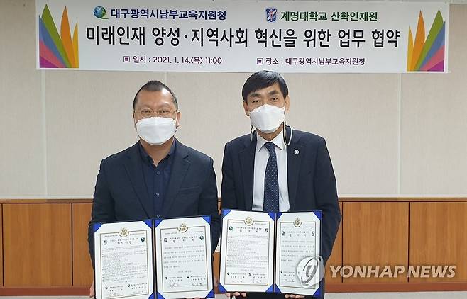 (대구=연합뉴스) 대구남부교육지원청과 계명대 산학인재원은 14일 인적·물적 인프라 공유 등 교류를 강화해 지역 친화적 교육혁신에 협력하는 협약을 했다. 2021.1.14 [대구남부교육지원청 제공. 재판매 및 DB 금지]