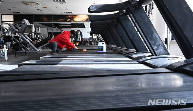 [용인=뉴시스] 김종택기자 = 14일 오후 경기도 용인시 수지구 한 휘트니스센터에서 관계자가 운동기구를 소독하며 영업준비를 하고 있다. 정부는 사회적 거리두기 수도권 2.5단계, 비수도권 2단계 조치 종료를 앞두고 헬스장 등 실내체육시설 집합금지를 완화하되 5인 이상 사적모임 금지 조치는 유지할 가능성이 높다고 밝혔다. 2021.01.14.