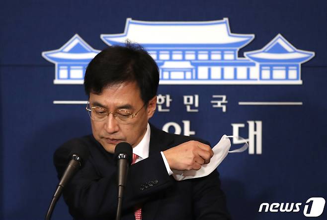(서울=뉴스1) 이광호 기자 = 강민석 청와대 대변인이 14일 오후 청와대 춘추관에서 박근혜 전 대통령에 대한 대법원의 유죄 확정판결과 관련한 브리핑에 앞서 마스크를 벗고 있다. 2021.1.14/뉴스1