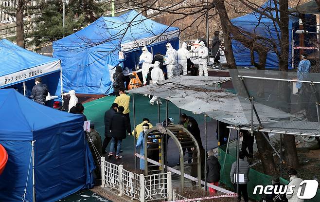 (인천=뉴스1) 정진욱 기자 = 14일 인천시 연수구의 한 아파트에서 신종 코로나바이러스 감염증(코로나19) 확진자 8명이 발생해 주민 2300명을 대상으로 전수 검사를 진행하고 있다. 해당 아파트에는 10~14일 8명의 확진자가 발생했다. 관련 누적 확진자는 15명까지 늘었다. 방역당국이 아파트 공터에서 주민을 대상으로 검체 검사를 진행하고 있다. 2021.1.14/뉴스1
