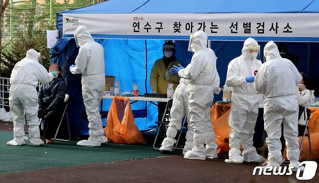 (인천=뉴스1) 정진욱 기자 = 14일 인천시 연수구의 한 아파트에서 신종 코로나바이러스 감염증(코로나19) 확진자 8명이 발생해 주민 2300명을 대상으로 전수 검사를 진행하고 있다. 해당 아파트에는 10~14일 8명의 확진자가 발생했다. 관련 누적 확진자는 15명까지 늘었다. 방역당국이 아파트 공터에서 주민을 대상으로 검체 검사를 진행하고 있다. 2021.1.14/뉴스1