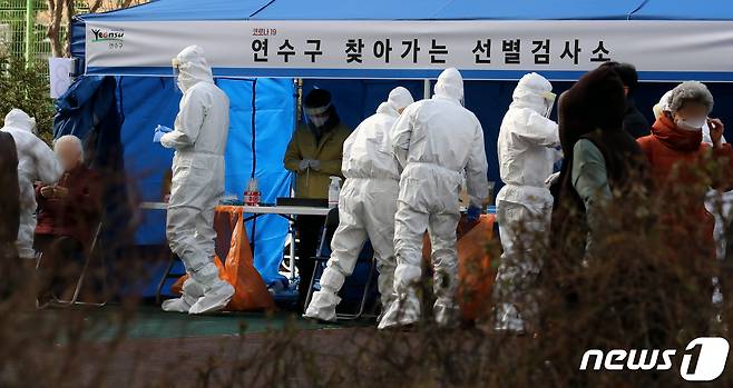 (인천=뉴스1) 정진욱 기자 = 14일 인천시 연수구의 한 아파트에서 신종 코로나바이러스 감염증(코로나19) 확진자 8명이 발생해 주민 2300명을 대상으로 전수 검사를 진행하고 있다. 해당 아파트에는 10~14일 8명의 확진자가 발생했다. 관련 누적 확진자는 15명까지 늘었다. 방역당국이 아파트 공터에서 주민을 대상으로 검체 검사를 진행하고 있다. 2021.1.14/뉴스1