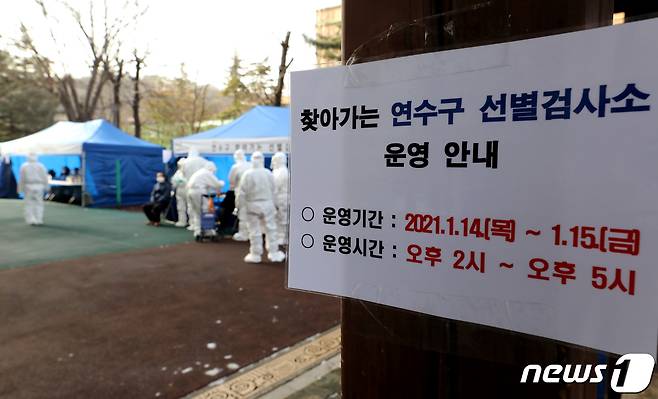 (인천=뉴스1) 정진욱 기자 = 14일 인천시 연수구의 한 아파트에서 신종 코로나바이러스 감염증(코로나19) 확진자 8명이 발생해 주민 2300명을 대상으로 전수 검사를 진행하고 있다. 해당 아파트에는 10~14일 8명의 확진자가 발생했다. 관련 누적 확진자는 15명까지 늘었다. 방역당국이 아파트 공터에서 주민을 대상으로 검체 검사를 진행하고 있다. 2021.1.14/뉴스1