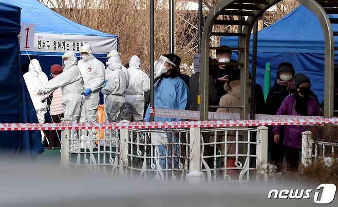 (인천=뉴스1) 정진욱 기자 = 14일 인천시 연수구의 한 아파트에서 신종 코로나바이러스 감염증(코로나19) 확진자 8명이 발생해 주민 2300명을 대상으로 전수 검사를 진행하고 있다. 해당 아파트에는 10~14일 8명의 확진자가 발생했다. 관련 누적 확진자는 15명까지 늘었다. 방역당국이 아파트 공터에서 주민을 대상으로 검체 검사를 진행하고 있다. 2021.1.14/뉴스1