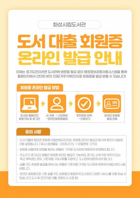 화성시립도서관 홈페이지에서 회원가입 및 로그인한 후 ‘내 서재’의 ‘나의 정보’에서 ‘온라인 회원증 발급’을 선택하고 주민등록번호를 입력하면 거주지 확인 및 발급이 완료된다.